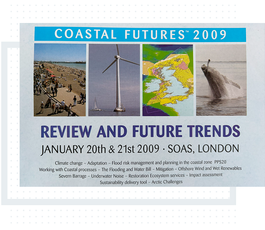 The first ‘Coastal Futures’ meeting was held in 1994 and called ‘Marine Environmental Management – Review of Events in 1993 and Future Trends’; this morphed into Coastal Futures in 2000. The idea for the Coastal Futures conference arose from a combination of three inter-related ideas. Firstly, annual review, taking stock and looking to the future. Secondly, in environmental terms this cyclical review process derived from thinking around environmental management systems. Thirdly, the long term perspective by considering sustainability which was becoming commonplace in the early 1990s.
